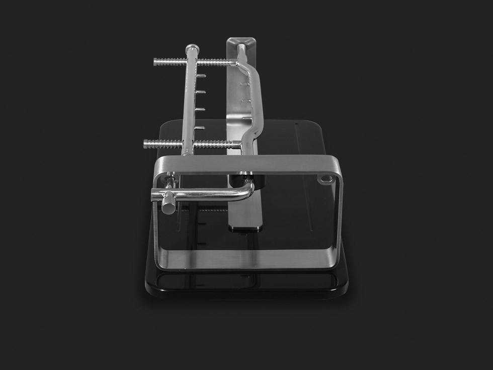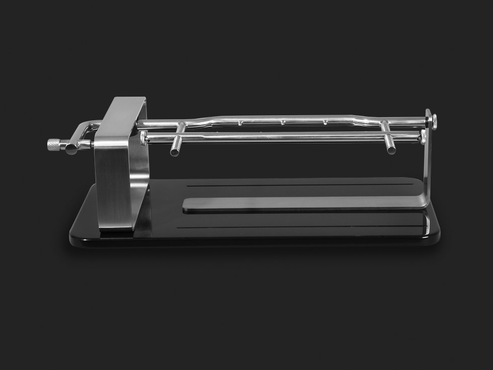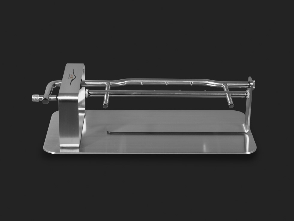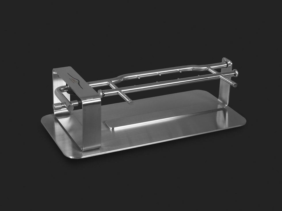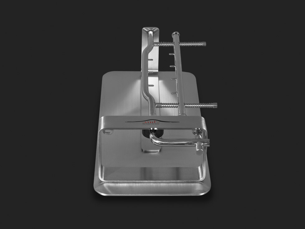 Jamonero realizado en acero inox calidad 304 y la base en acero o en color en Ir’o. Multiposicionable gracias a un sistema que permite fijarlo horizontalmente según las necesidades del cortador.